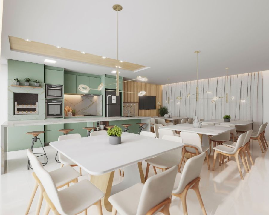 * Espaço gourmet, salão de festas e churrasqueira.