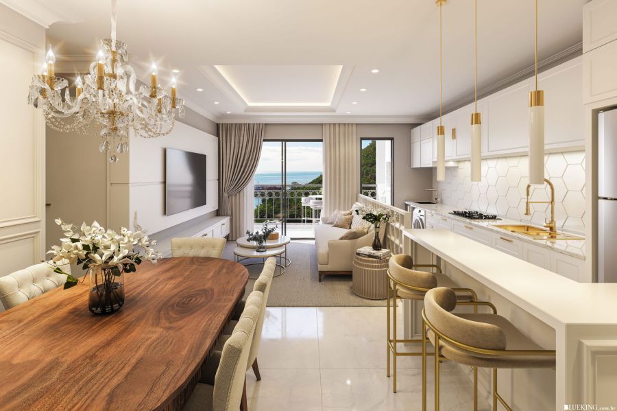 Ao adentrar o imóvel, percebe-se a integração fluida entre os ambientes. A área social é composta por duas salas amplas que se conectam harmoniosamente à cozinha americana, criando um cenário ideal para momentos em família. A transição para a sacada com churrasqueira estende o living, proporcionando um refúgio particular para relaxar ao final do dia ou receber amigos com privacidade e elegância.
